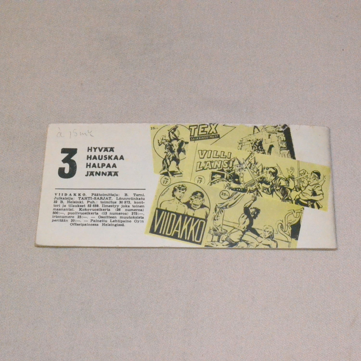 Kulunut mutta kohtuullisen siisti. Takakannessa vanha hinta lyijykynällä. Kuvien mukainen.