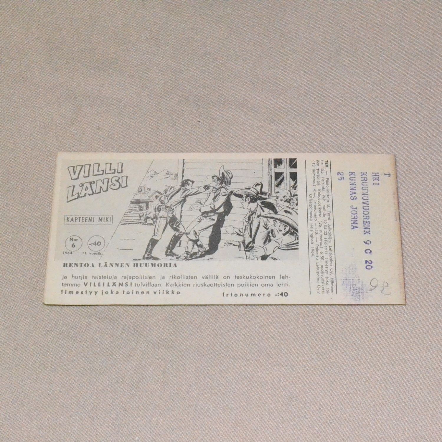 Erittäin siisti. Takakannessa vanha hinta lyijykynällä. Kuvien mukainen.