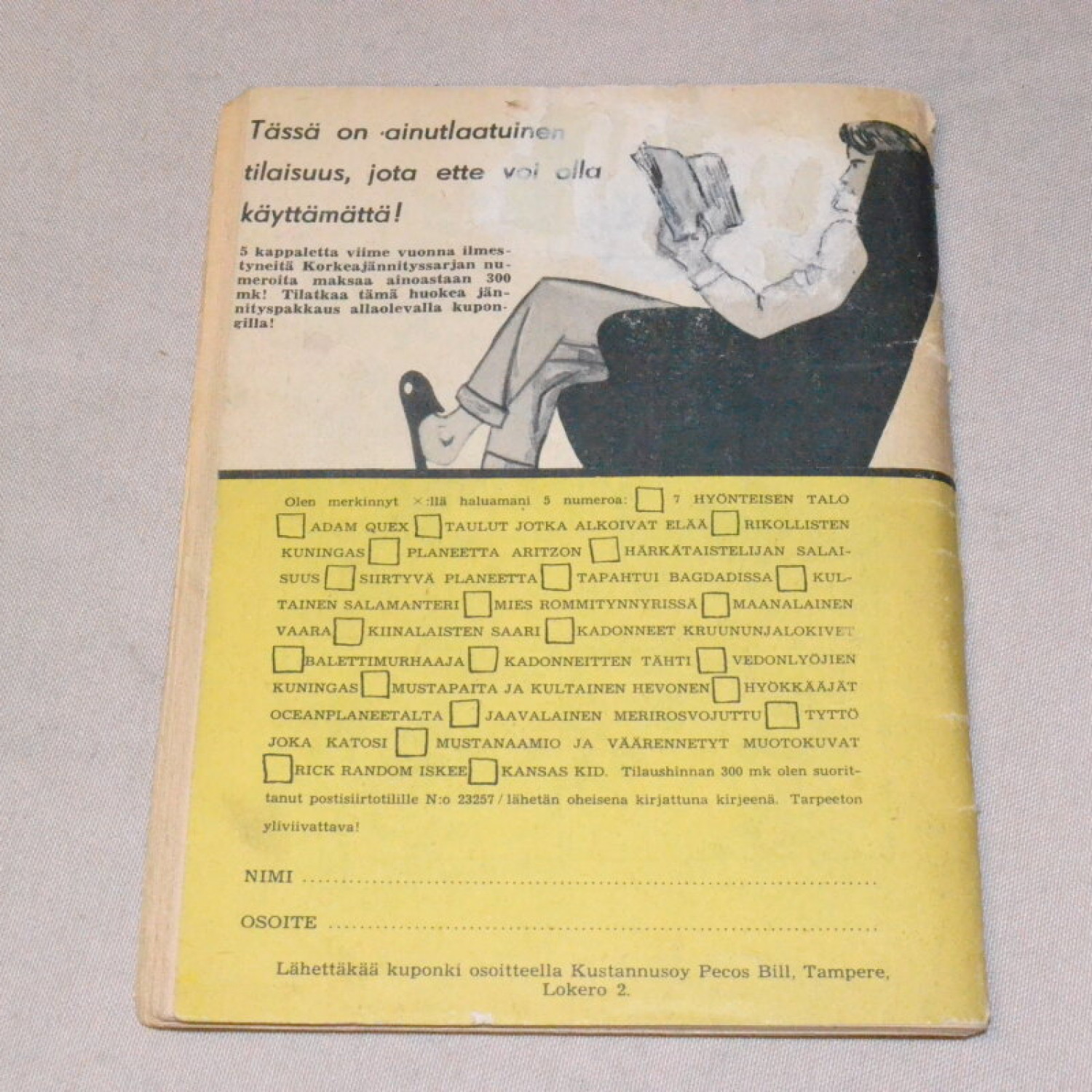 Kulunut mutta kohtuullisen siisti. Kannen alareunassa pientä mustetahraa, takakannen kuponkiin kirjo..
