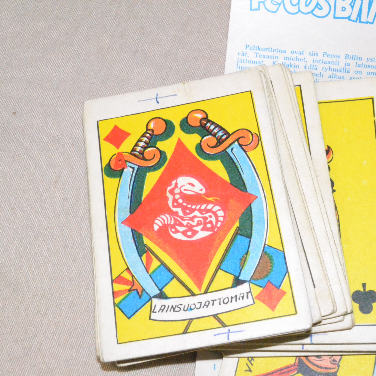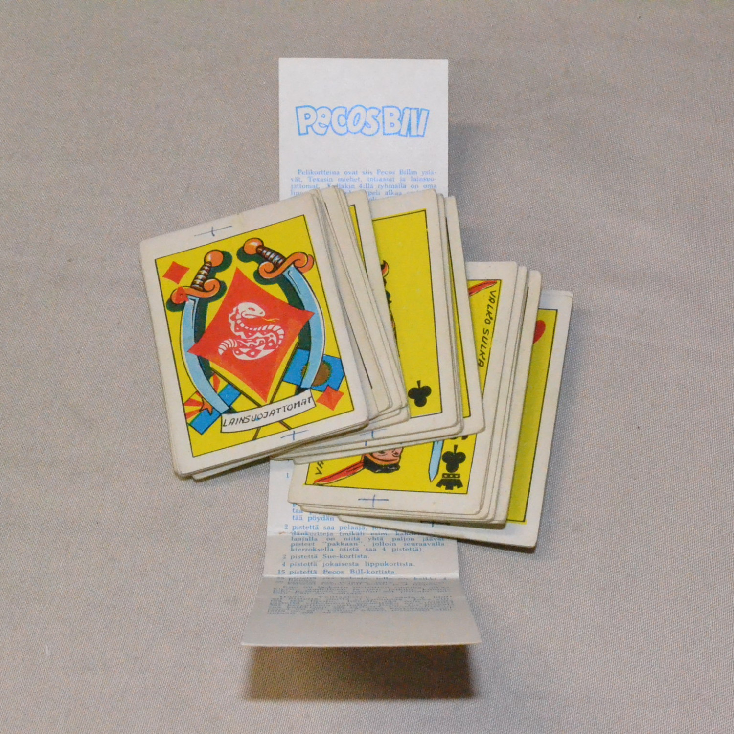 Artkon kustantamat pelikortit 1950-60-luvun tietämiltä. Kotelossa on pientä kulumaa ja nirhaumaa sekä pientä lyijykynänjälkeä. Kortteihin (40 kpl) on jostain syystä jokaiseen piirretty risti sekä ylä- että alareunaan. Muuten kortit ovat ehjiä ja melko siistejä (selvästi näillä on jonkin verran pelattu). Kuvien mukainen.