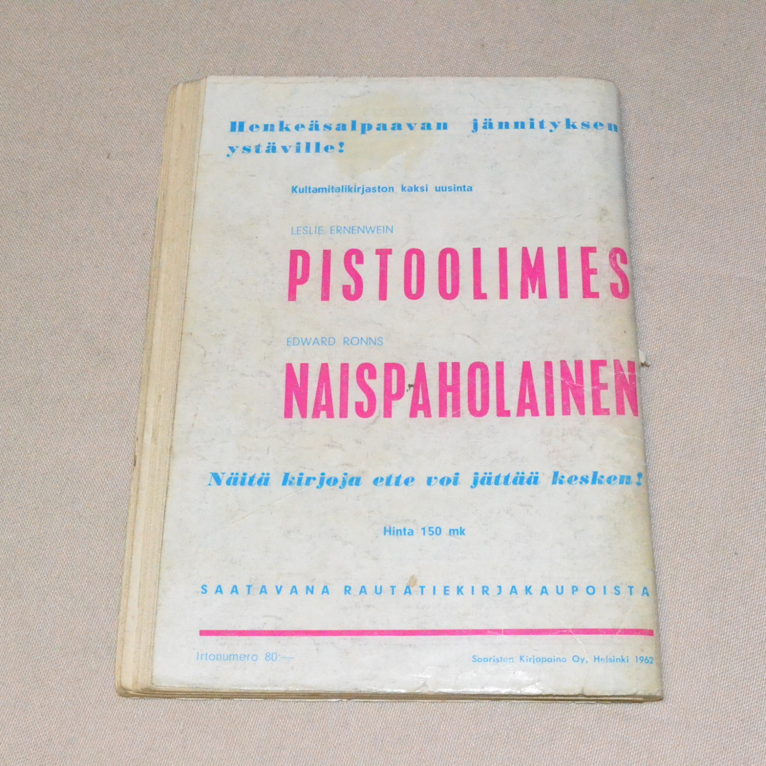 Lievästi kulunut mutta melko siisti. Kannessa pieni pintarikko, kansilehdellä kirjoitusta. Takakanne..