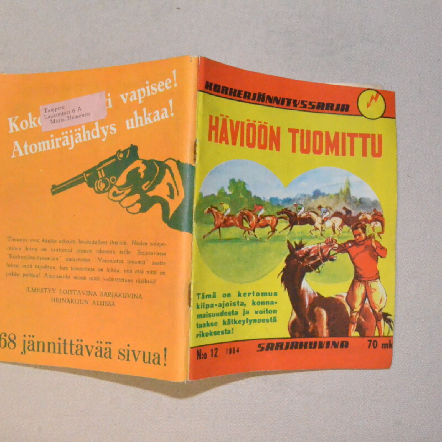 Kulunut kappale. Selkä kauttaaltaan teipattu tökerösti, kannen reunoissa repeämää ja pientä palapuut..