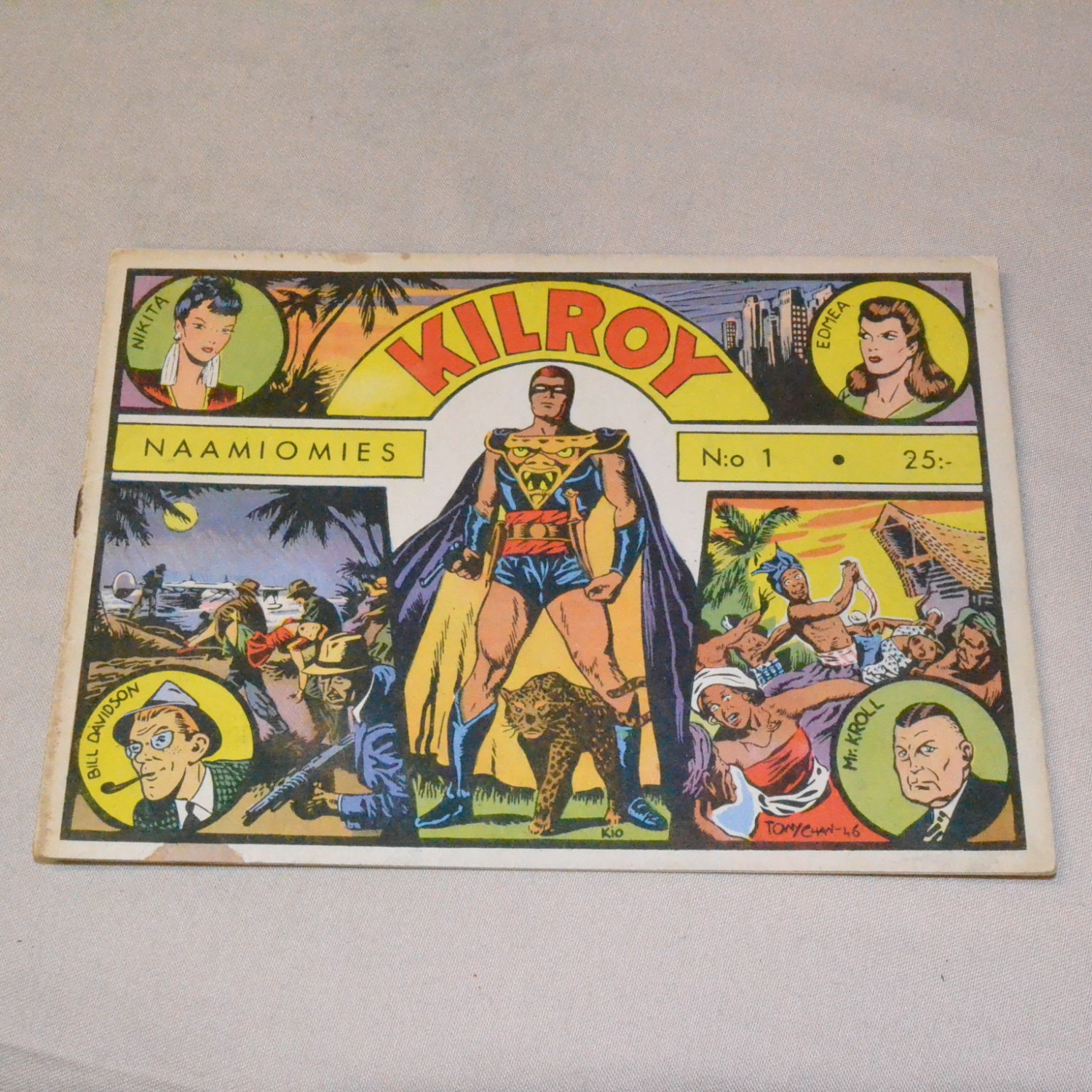 Ensimmäinen Suomessa julkaistu Kilroy-lehti. Kulunut mutta kohtuullisen siisti. Kansien reunoissa pientä tahraa, niitissä ruostetta. Kuvien mukainen.