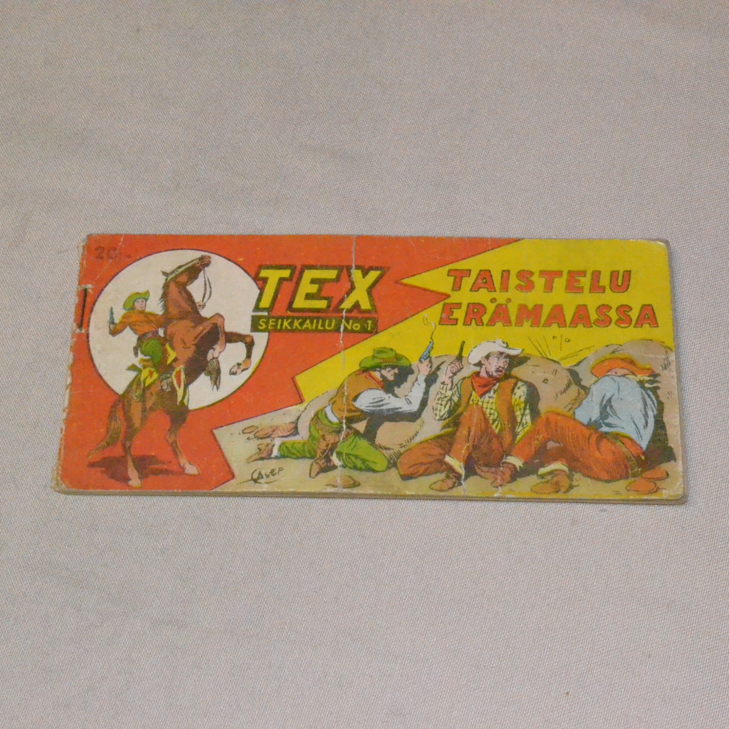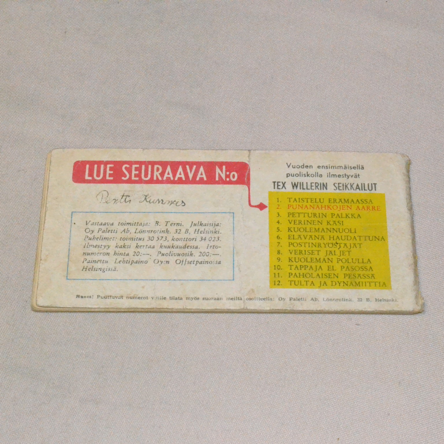 Kansissa runsaasti kulumaa, takakanteen kirjoitettu nimi. Myös etusisäkannessa ja ensimmäisellä sisäsivulla pientä kynänjälkeä. Kuvien mukainen. Ensimmäinen ilmestynyt ja samalla harvinaisin Tex-liuska.