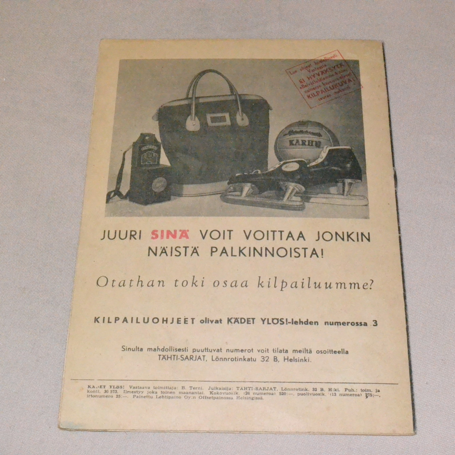 Kulunut mutta kohtuukuntoinen. Selkämyksen puoleisella sivulla mappireiät läpi lehden. Kuvien mukain..