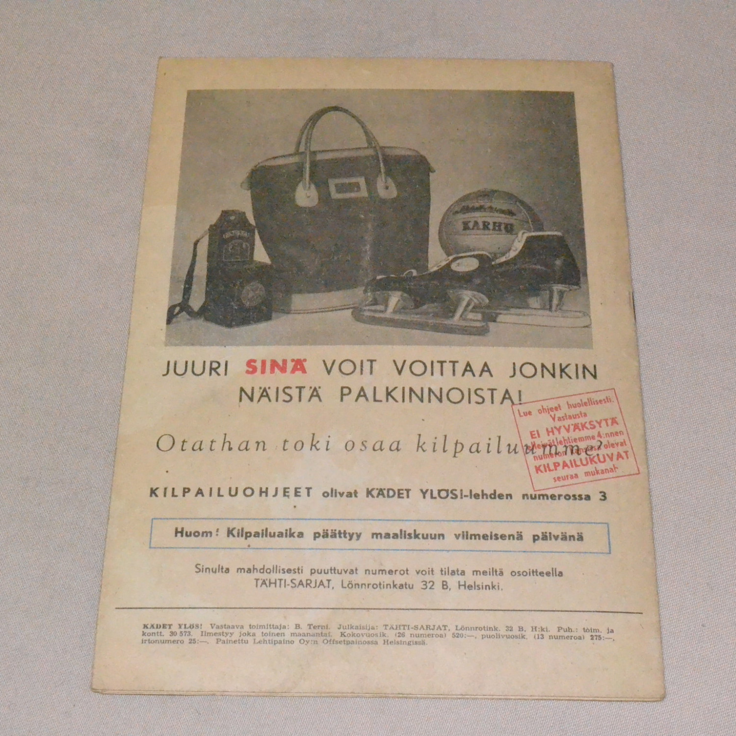 Kulunut mutta kohtuukuntoinen. Takakannessa kynänjälkeä, ensimmäisellä sisäsivulla kosteusjälkeä. Ku..