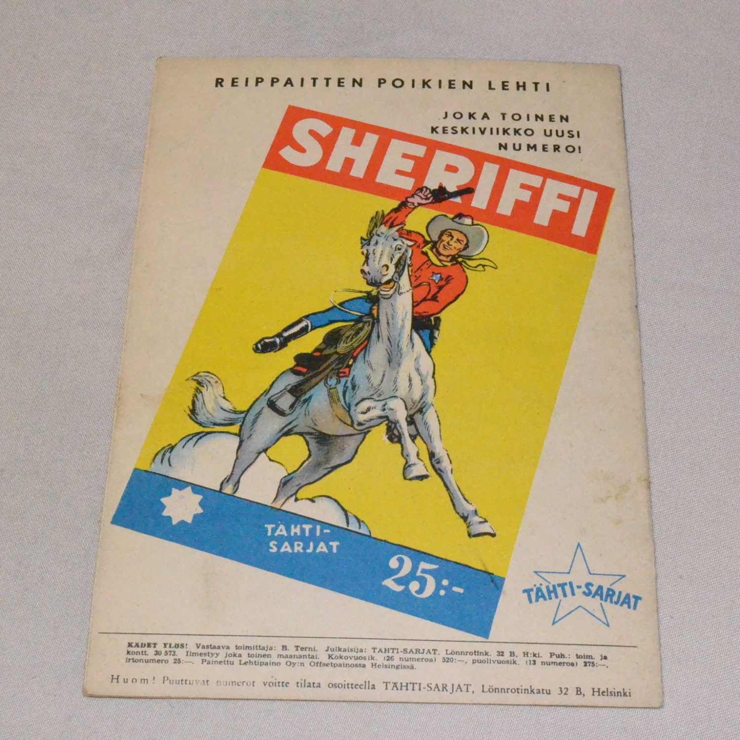 Kulunut lehti. Kansissa kynänjälkeä, takakannen repeämä teipattu. Kuvien mukainen...