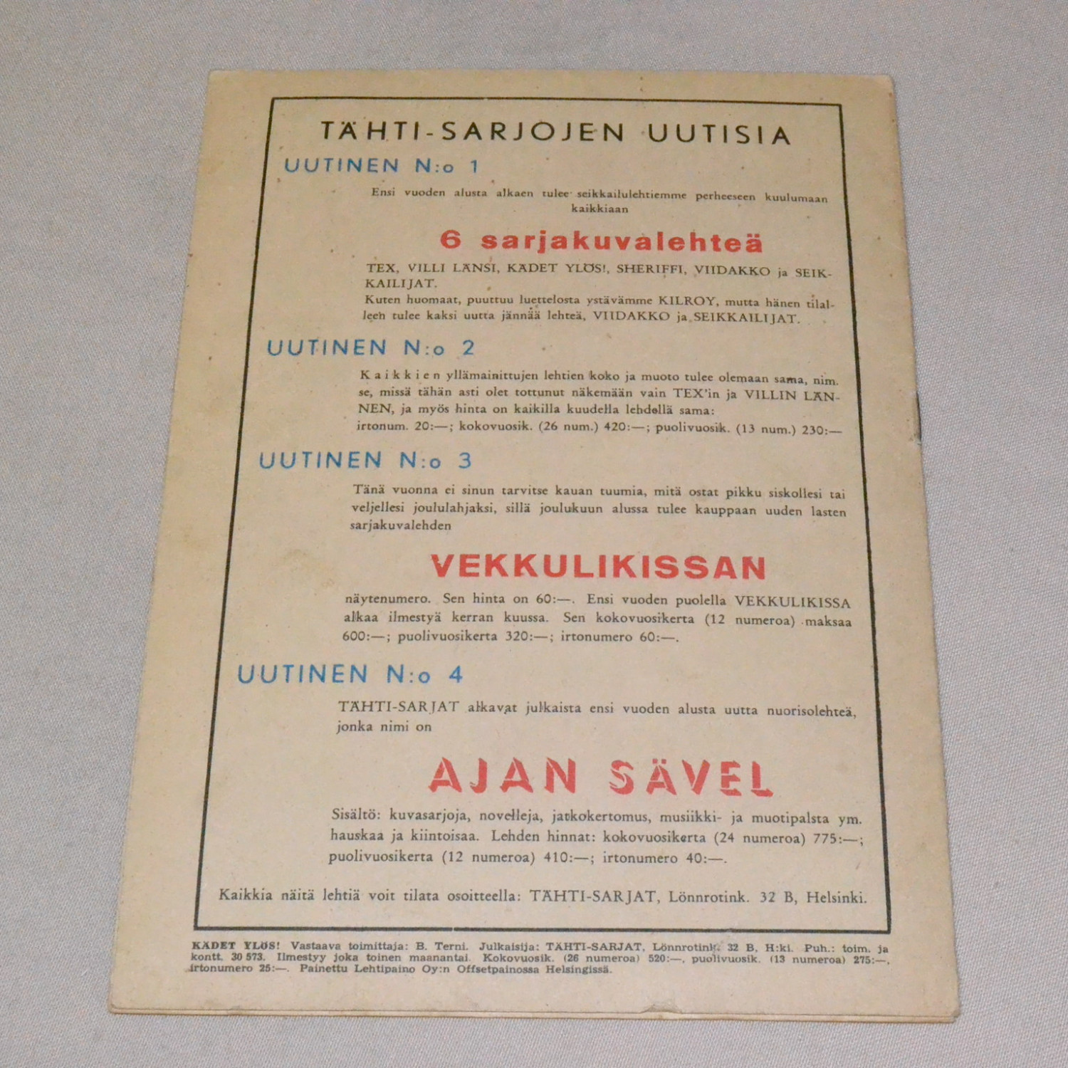 Kulunut lehti. Kansissa kynänjälkeä, takakannen repeämä teipattu. Kuvien mukainen...