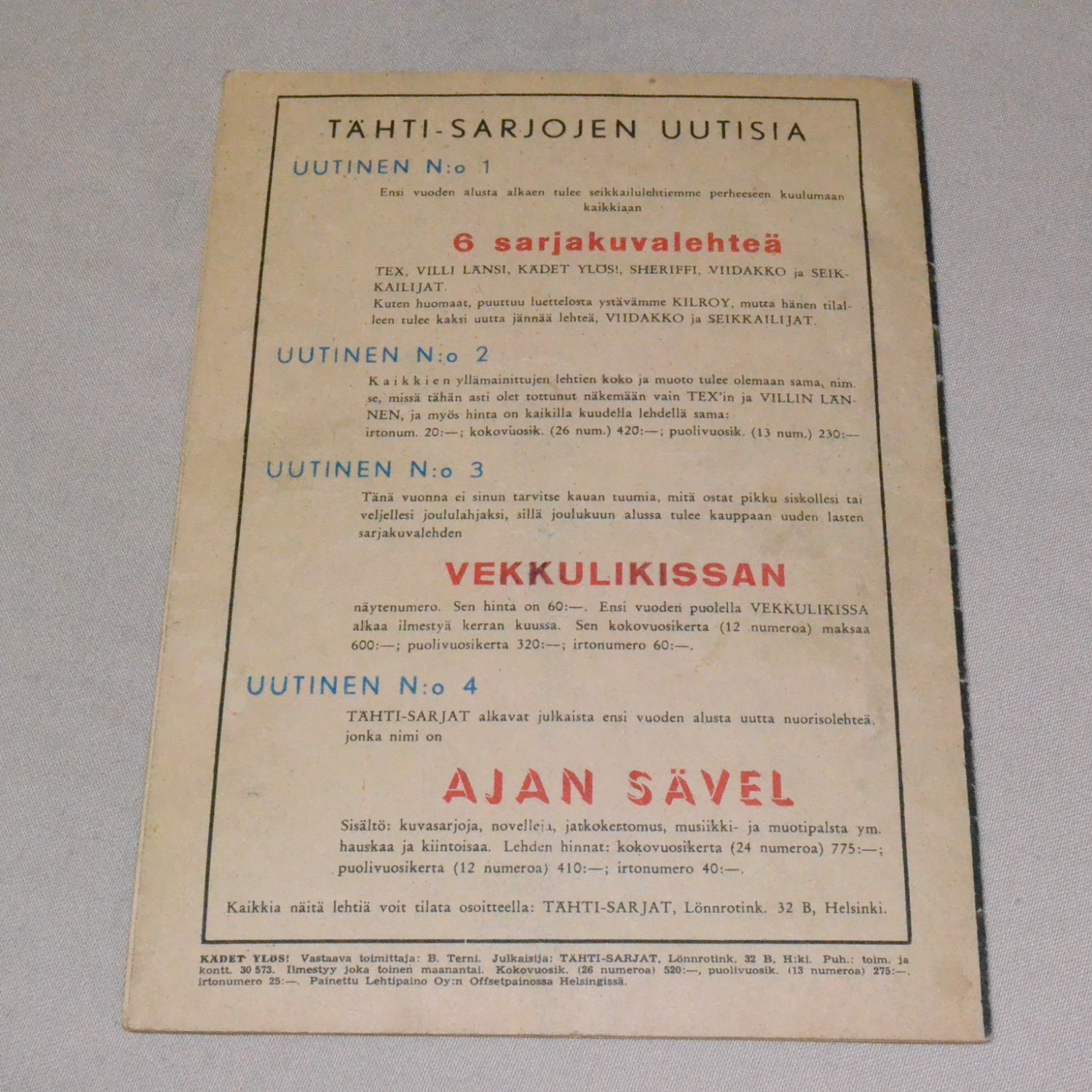 Kulunut lehti. Kansissa kynänjälkeä, takakannen repeämä teipattu. Kuvien mukainen...