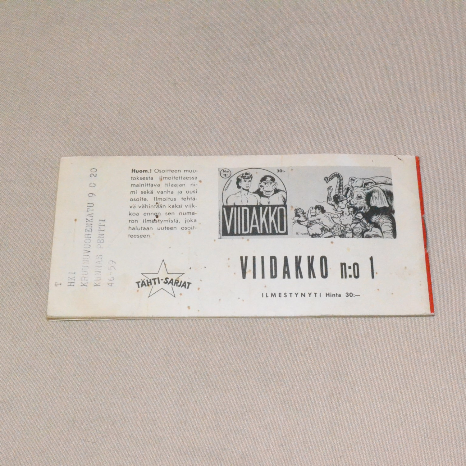 Selkä auki lähes koko matkalta ja vain juuri ja juuri kiinni. Takakannesta osoitelappu revitty puoli..