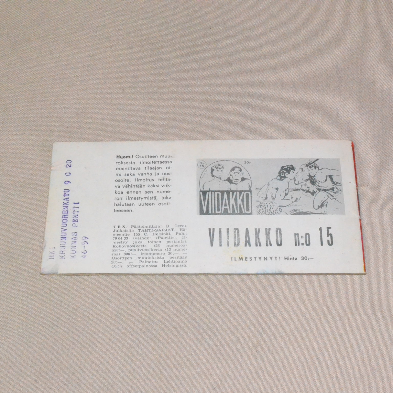 Selkä auki lähes koko matkalta ja vain juuri ja juuri kiinni. Takakannesta osoitelappu revitty puoli..