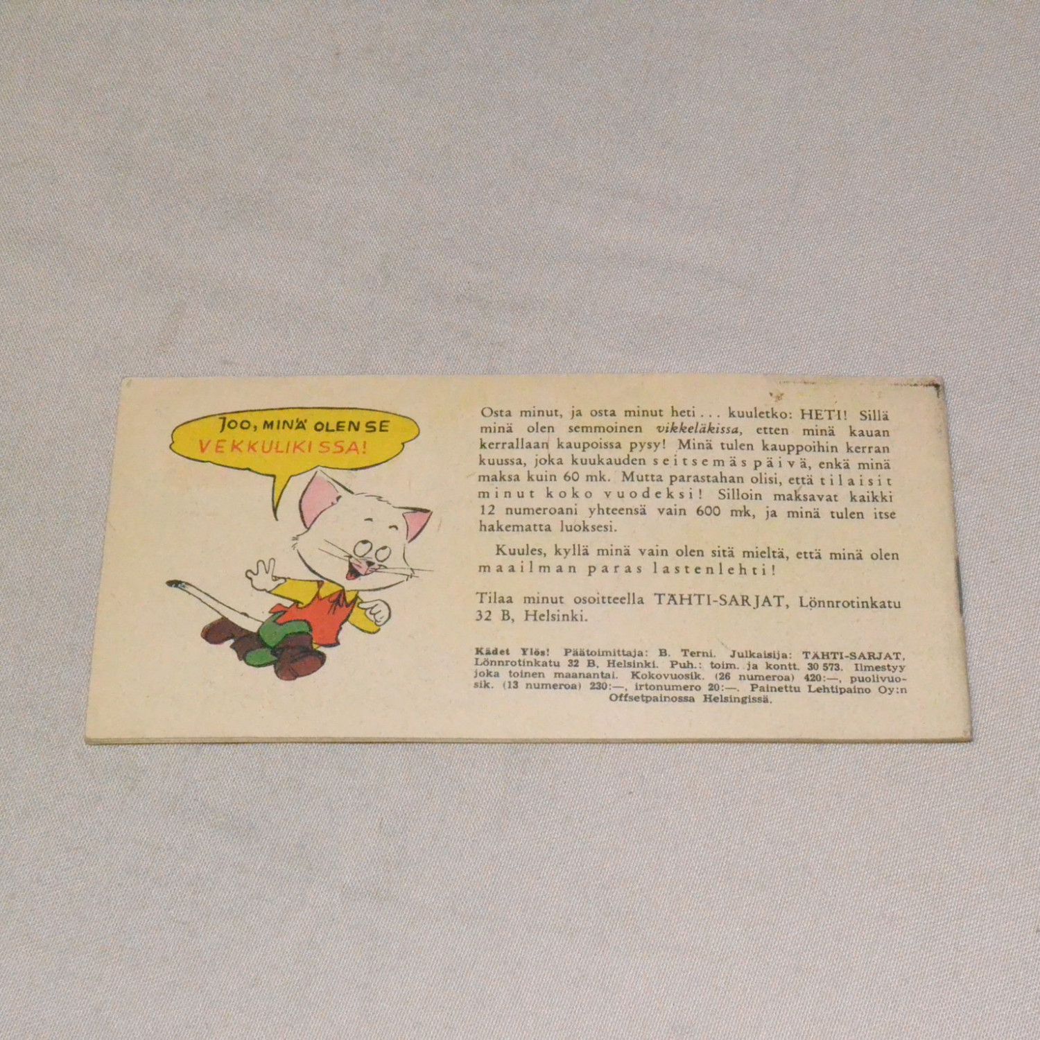 Ensimmäinen Suomessa julkaistu tämän sarjan lehti. Kulunut lehti. Lehden reunassa tahraa ja pientä r..