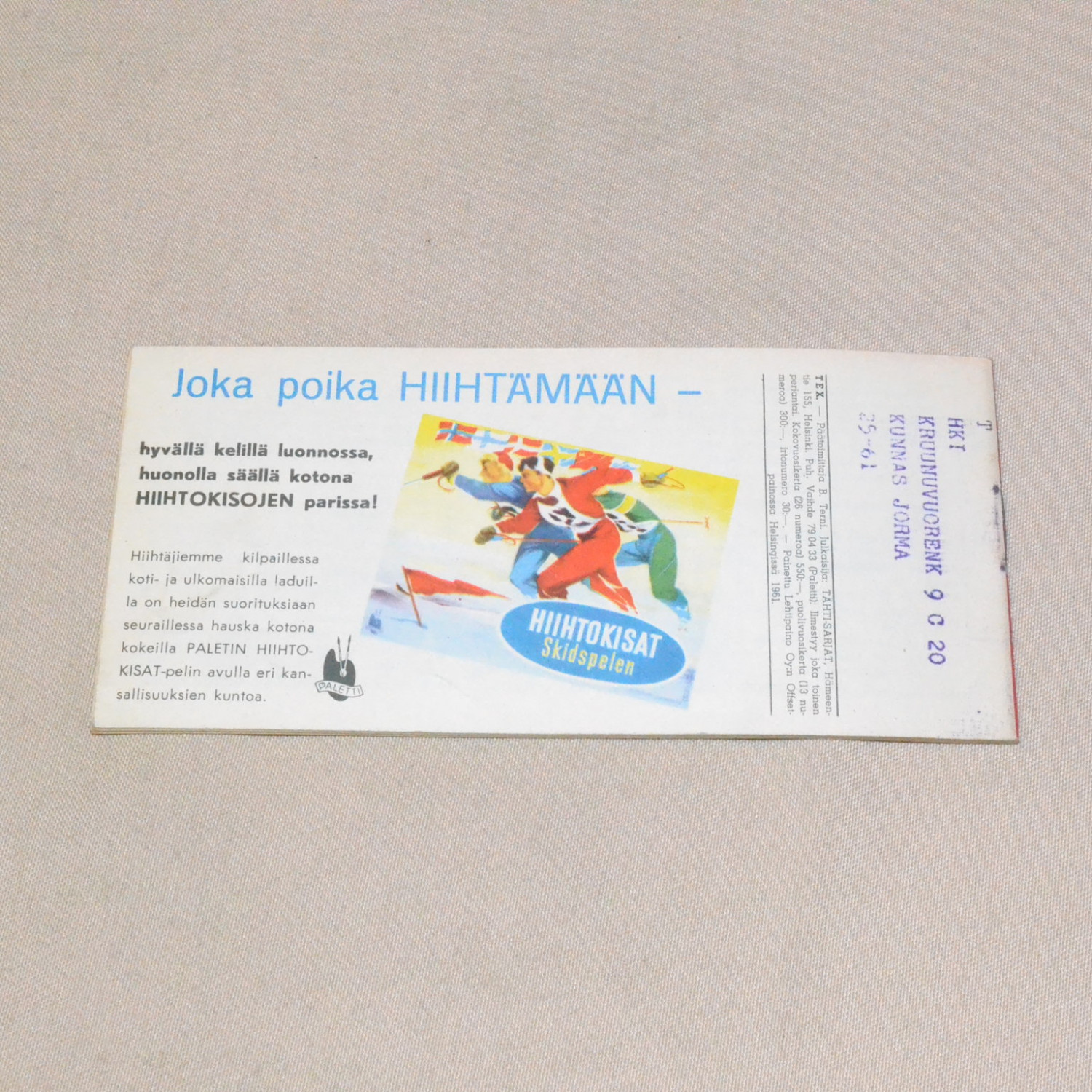 Kulunut mutta kohtuukuntoinen. Takakannessa pientä lyijykynänjälkeä ja sentin repeämä niitin vieress..