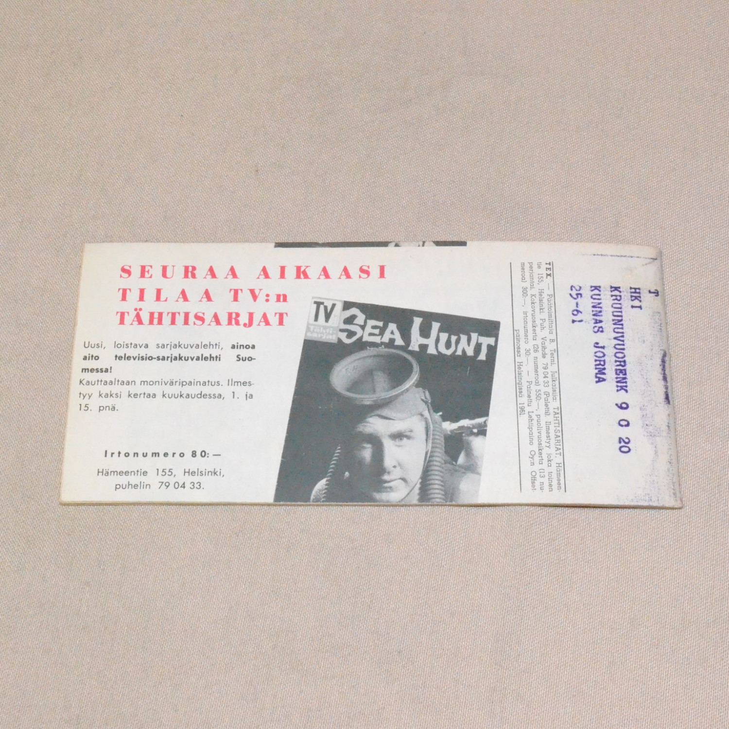 Kulunut mutta kohtuukuntoinen. Takakannessa pientä lyijykynänjälkeä ja sentin repeämä niitin vieress..