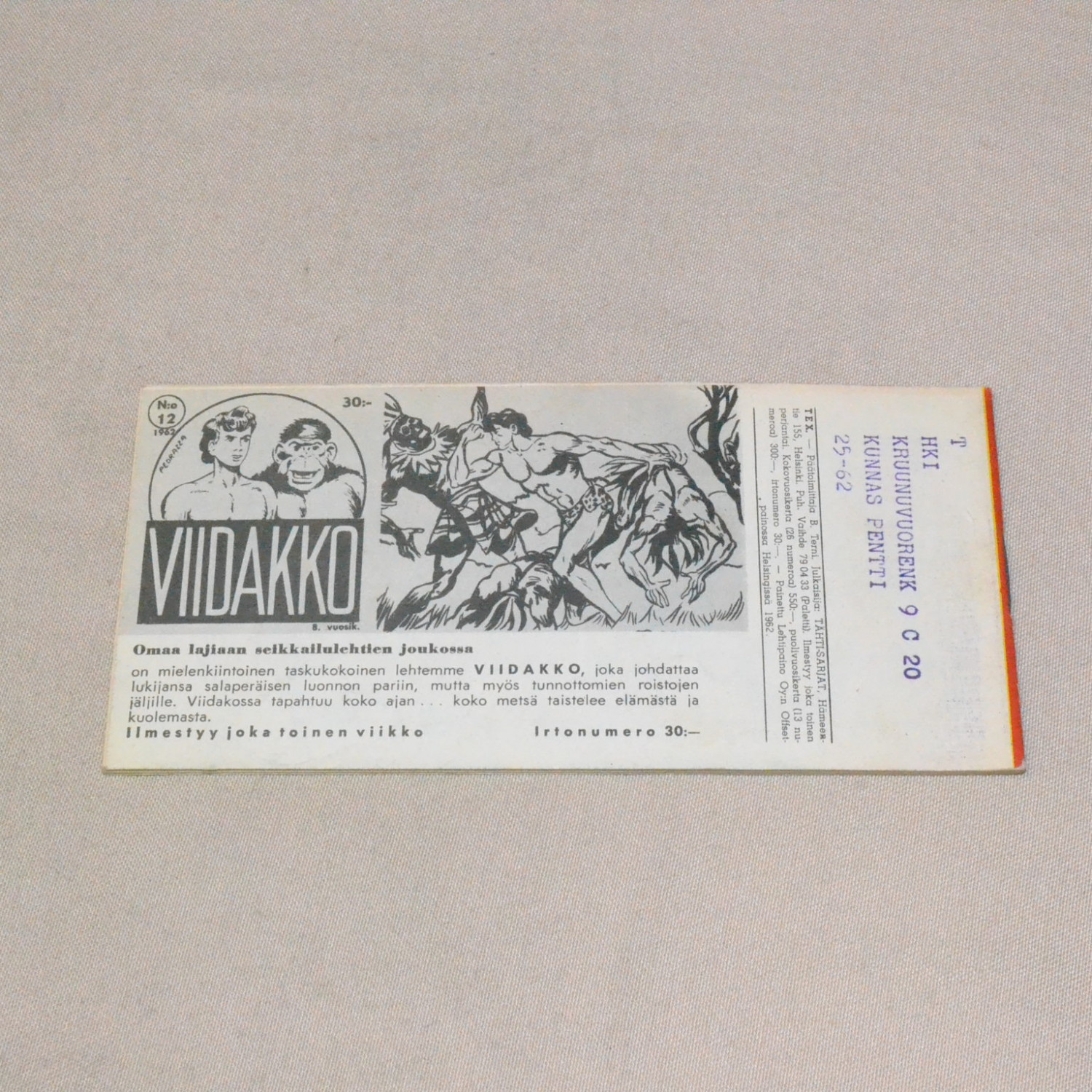 Kulunut mutta kohtuukuntoinen. Selän päissä teippauksen jäljet (ei kuitenkaan repeämää). Kuvien..