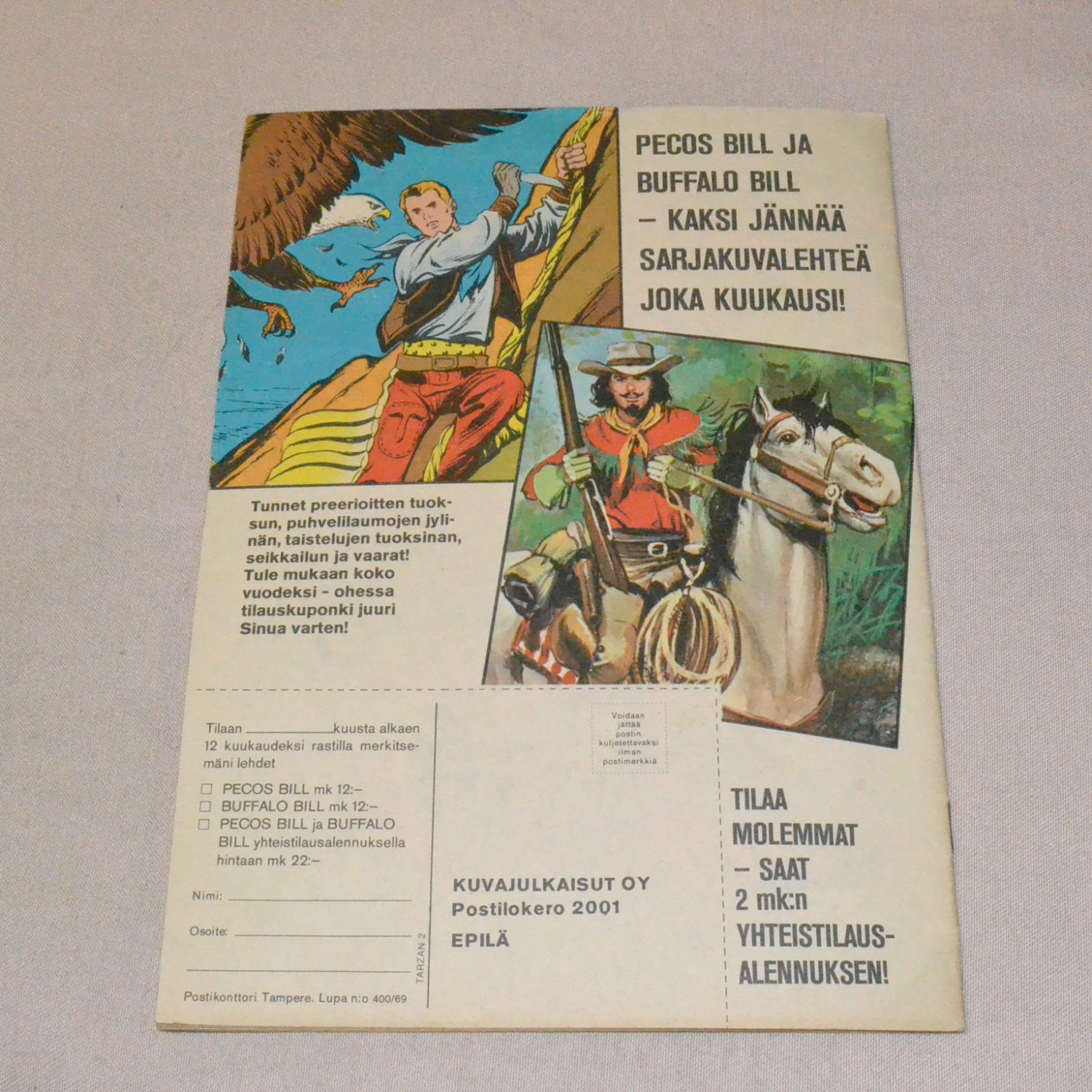 Paperilaadun (sanomalehtipaperi) huomioon ottaen hyvin säilynyt kappale. Keskiaukeman juliste talles..