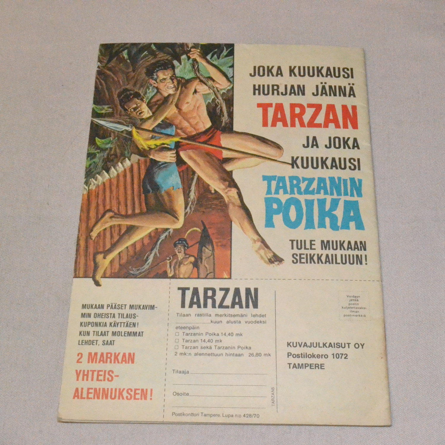 Ensimmäinen Suomessa ilmestynyt Tarzan-lehti. Erittäin kulunut. Selässä ja varsinkin alaniitin kohda..