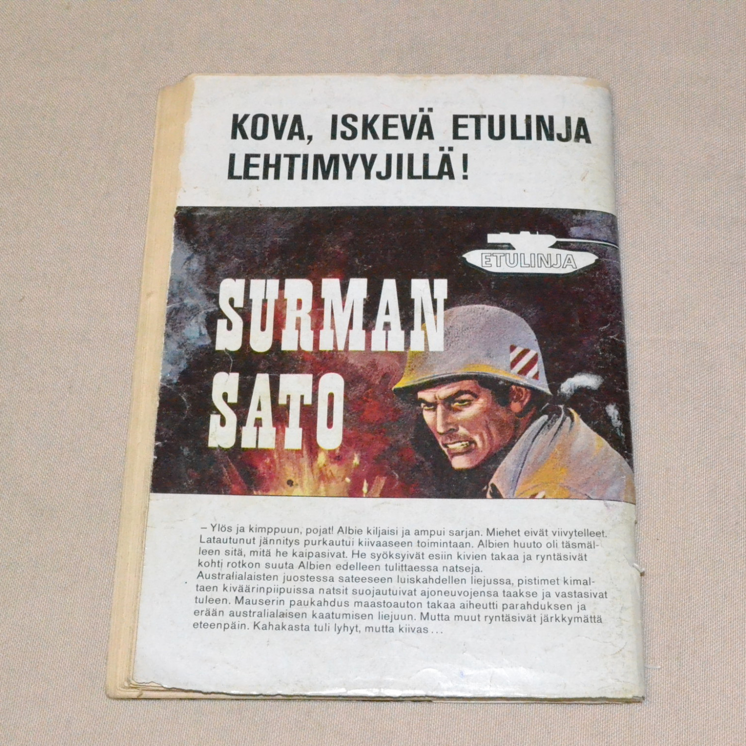 Lievästi kulunut mutta melko siisti. Takakannen ja loppupään sivujen yläkulmassa pientä palapuutosta..