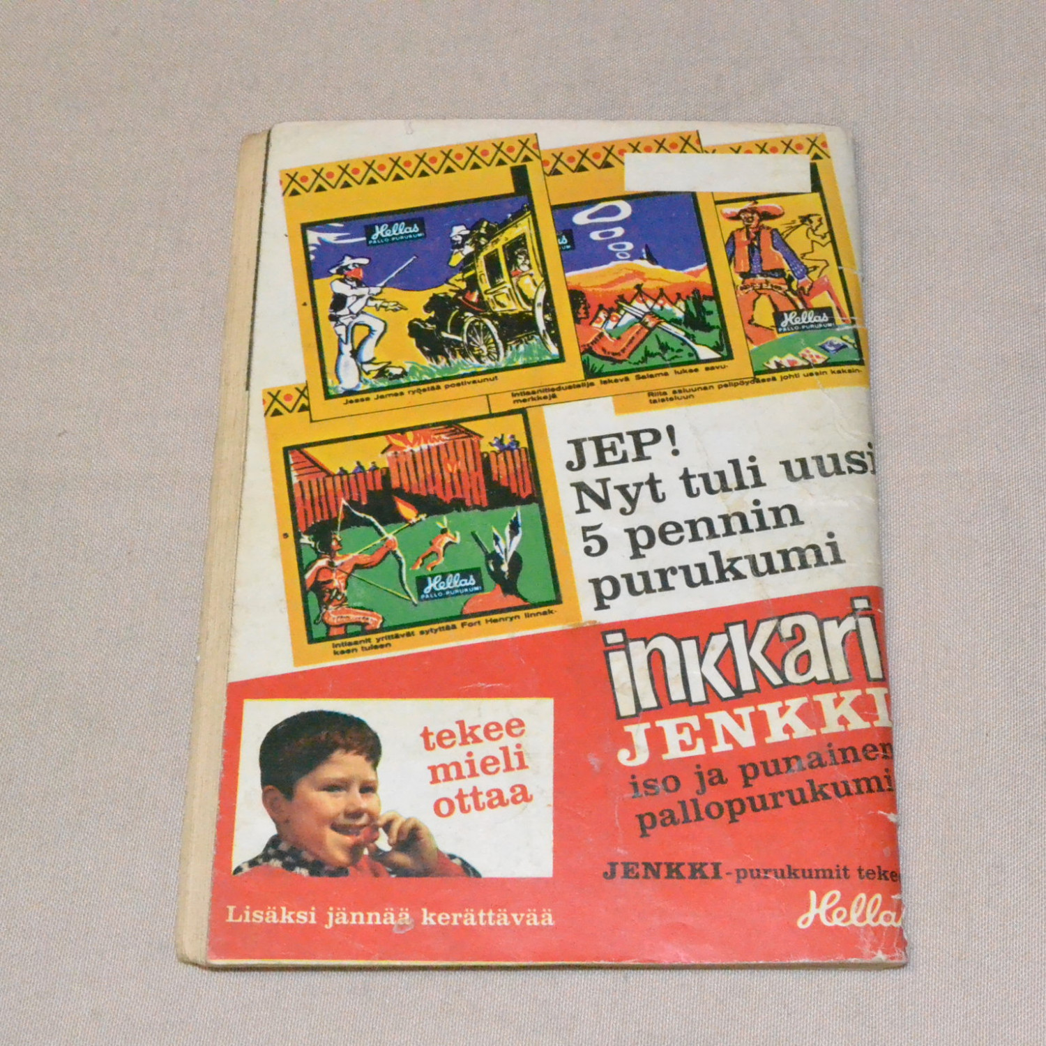 Selän alakulmassa teippauksen jäljet. Kannen otsikkotekstin ensimmäinen kirjain väritetty. Kuvien mu..