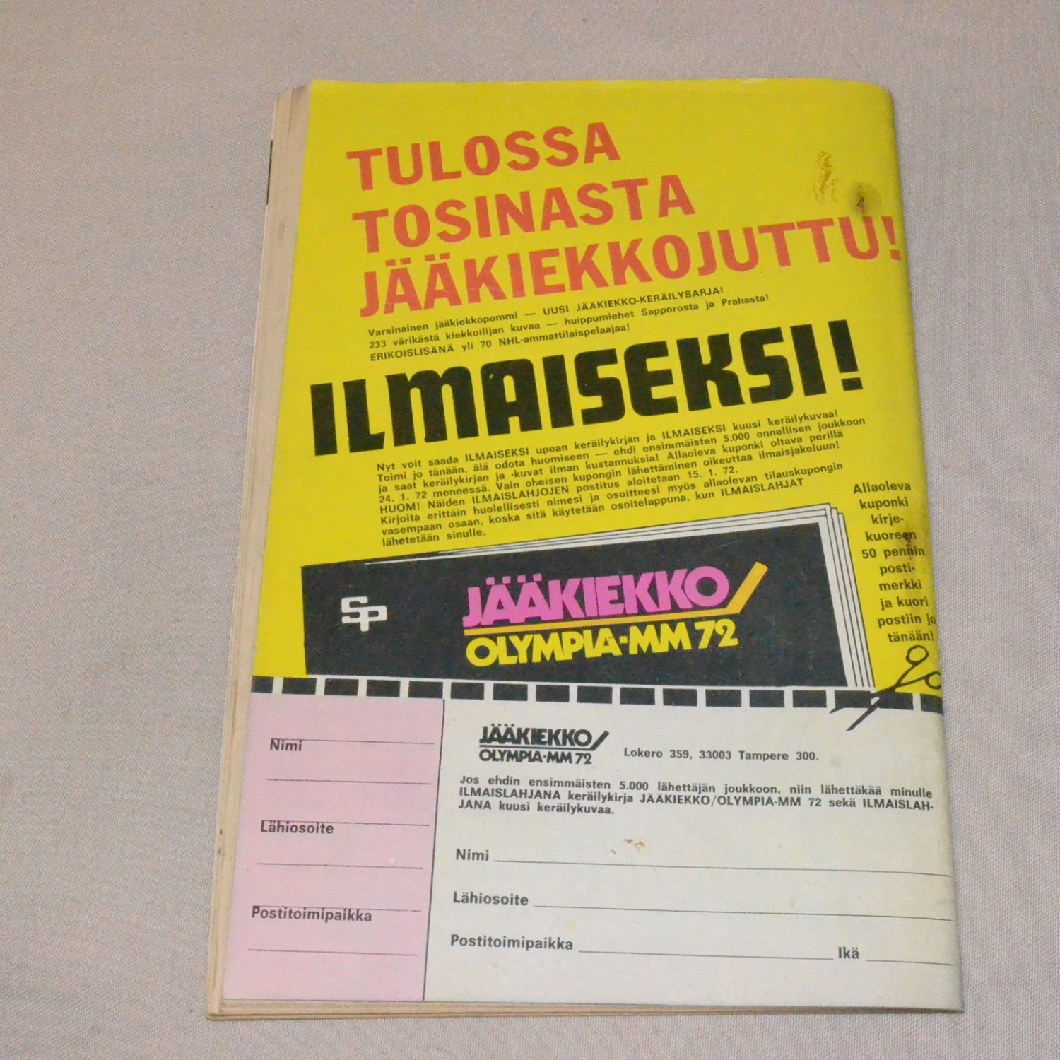 Kulunut mutta melko siisti. Niiteissä ruostetta, kannessa pieni kynänjälki. Takakannessa pientä tahraa. Kuvien mukainen.