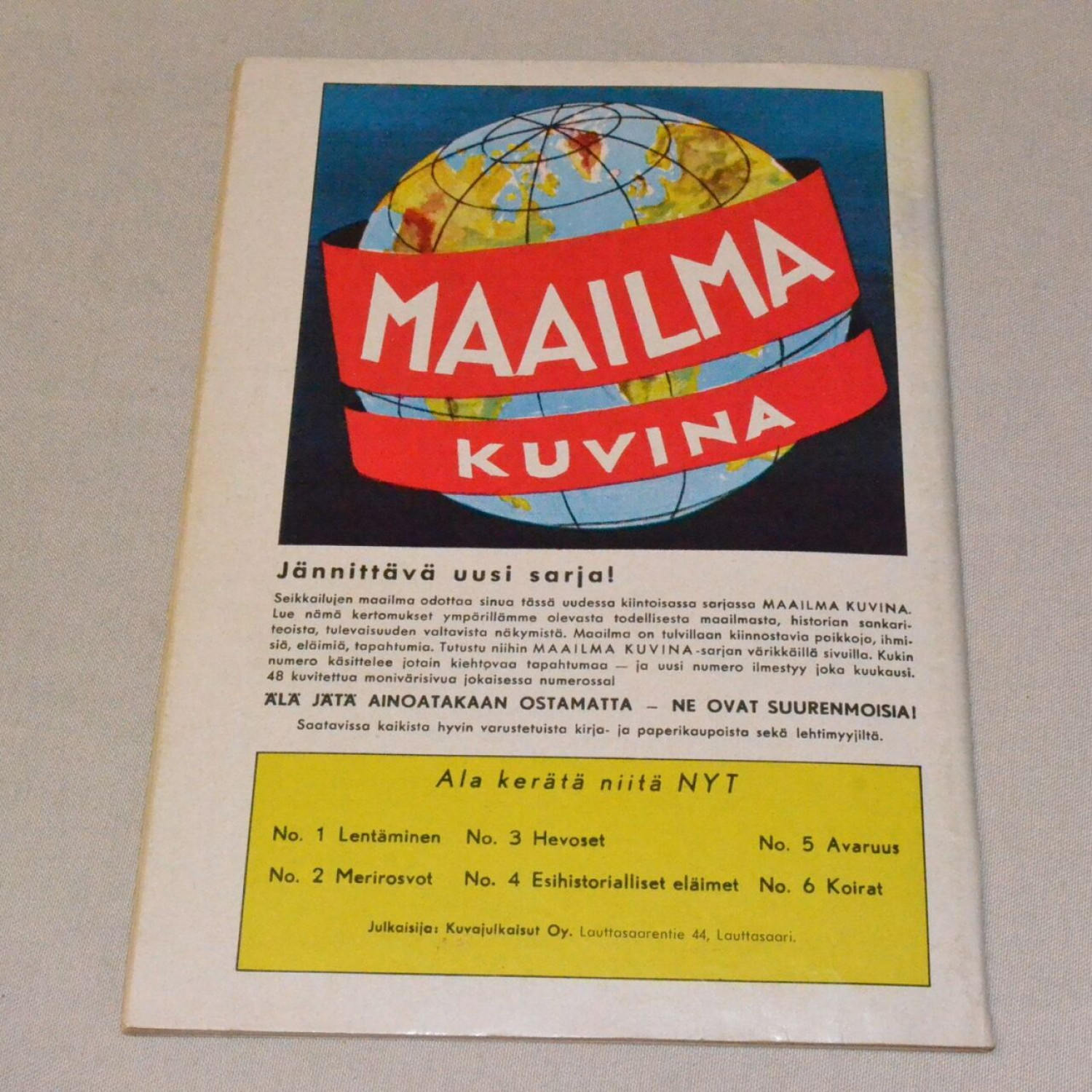 Kansissa kulumaa, kannen kulmassa taitosta. Yleisilmeeltään siisti. Kuvien mukainen...