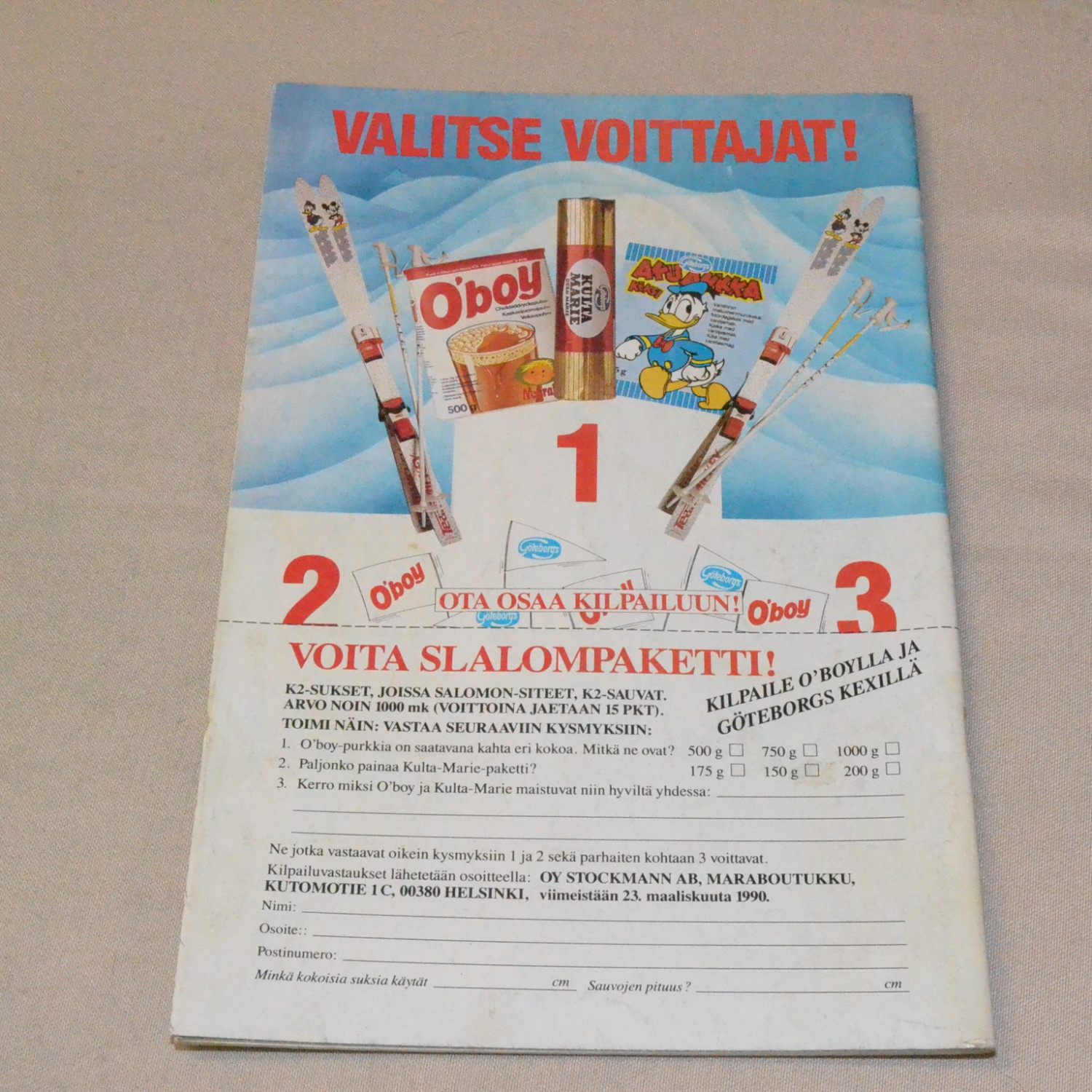 Kulunut lehti. Kansissa teippauksia, kanteen kirjoitettu nimi. Keskiaukeamalta leikattu kuponki. Ens..